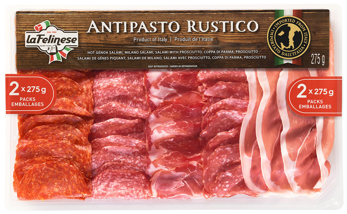 Hot Genoa salami: Pork . Salt . Seasoning (sugars [dextrose], potassium chloride, inulin, pepper extract) * Spices . Paprika * Sodium ascorbate * Potassium nitrate * Dehydrated garlic * Sodium nitrite ' Bacterial culture. Milano salami: Pork ' Salt ' Seasoning (sugars [dextrose], potassium chloride, inulin, pepper extract) * Spices ' Sodium ascorbate * Potassium nitrate * Dehydrated garlic ' Sodium nitrite * Bacterial culture. Salami with prosciutto: Pork * Salt * Seasoning (sugars [dextrose], potassium chloride, inulin, pepper extract), Spices . Sodium ascorbate ' Dehydrated garlic ' Potassium nitrate . Sodium nitrite . Bacterial culture. Coppa di Parma: Pork * Salt * Sugars (dextrose) * Sodium ascorbate * Spices * Dehydrated garlic * Potassium nitrate * Sodium nitrite . Spice extracts.