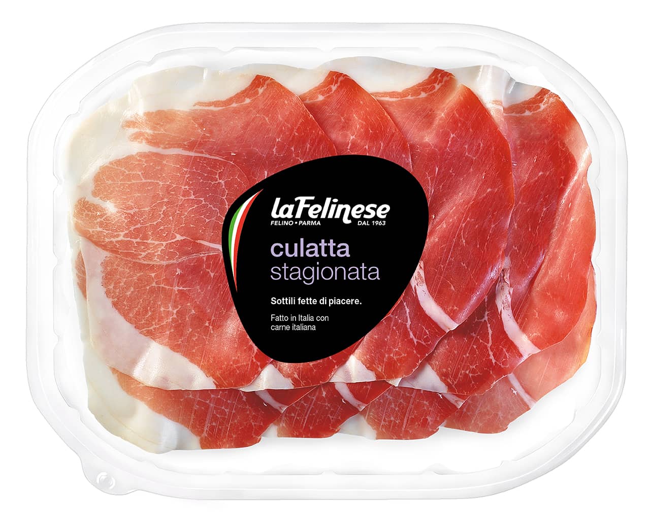Sottili fette di Culatta Stagionata dal sapore e profumo intenso e dalla incomparabile morbidezza, frutto della lunga stagionatura e del rispetto della tradizione.