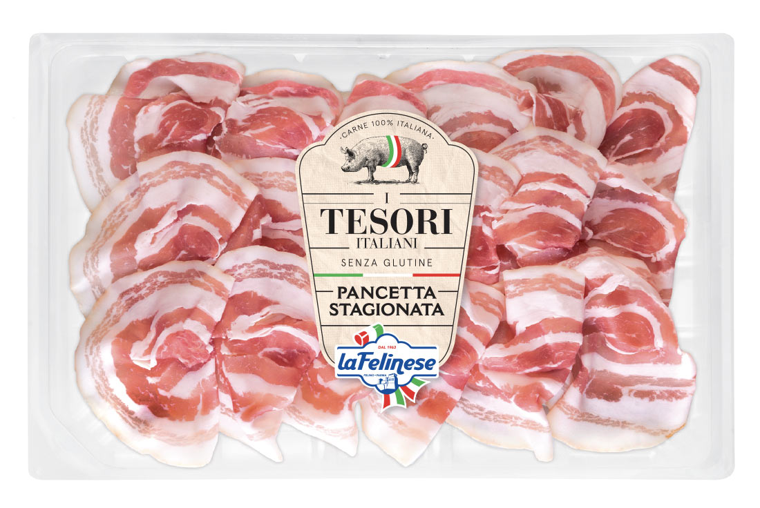 | Pancetta stagionata | 110 g | 295 x 25 x 188 mm |